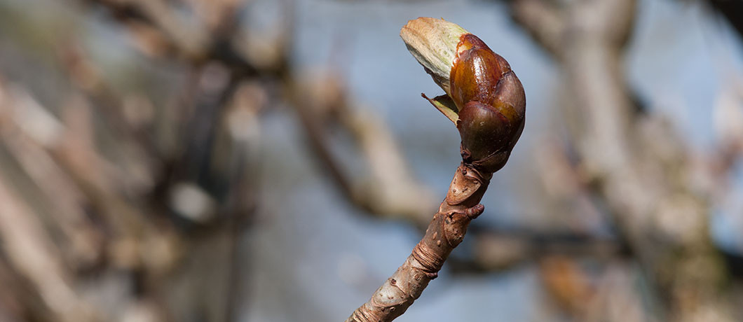 De knoppen van de paardenkastanje glimmen in de voorjaarszon. Eén van de eerste knoppen is al opengebarsten: het voorjaar gaat nu echt beginnen. Behalve de diverse knopschubben, die strak om de boomknop zitten, plakken de knoppen. Dat komt door de kleverige harslaag waarmee de paardenkastanje haar knoppen extra tegen de felle winterkou beschermt. Maar vandaag, met een temperatuur van rond de tien graden Celsius en met een beetje beschutting is die beveiliging niet meer nodig. De sapstromen in de boom doen de knop zwellen en openbreken. De jonge, nu nog opgevouwen blad en twijg drukken de schubben weg. En weg is ook de plakkerigheid.